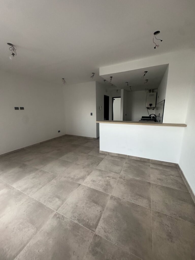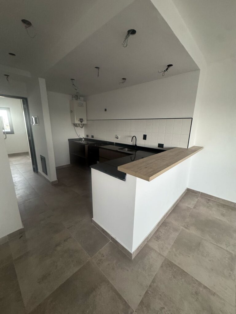Un dormitorio, baño, cocina comedor living.