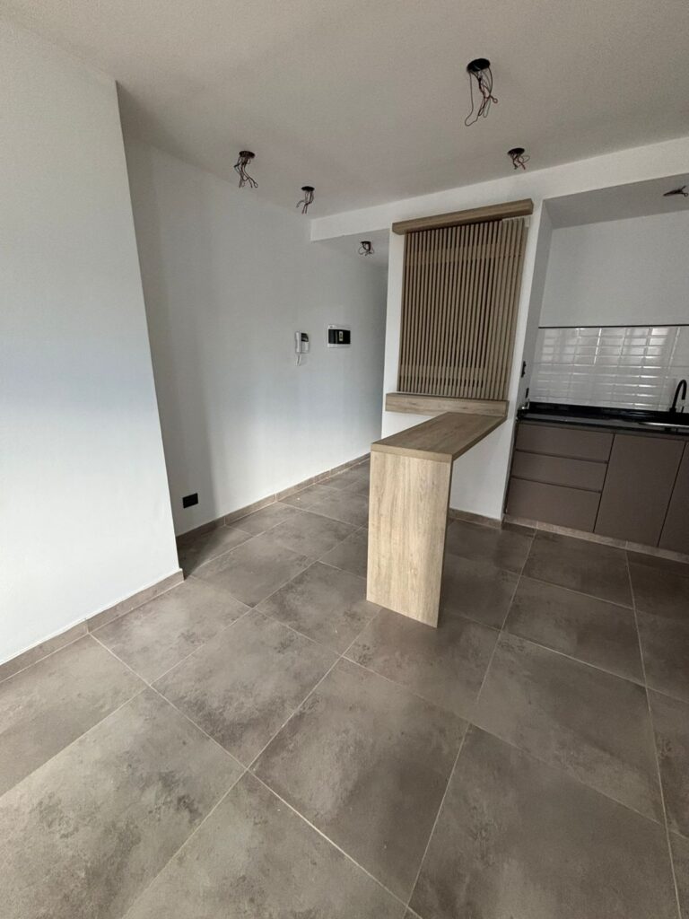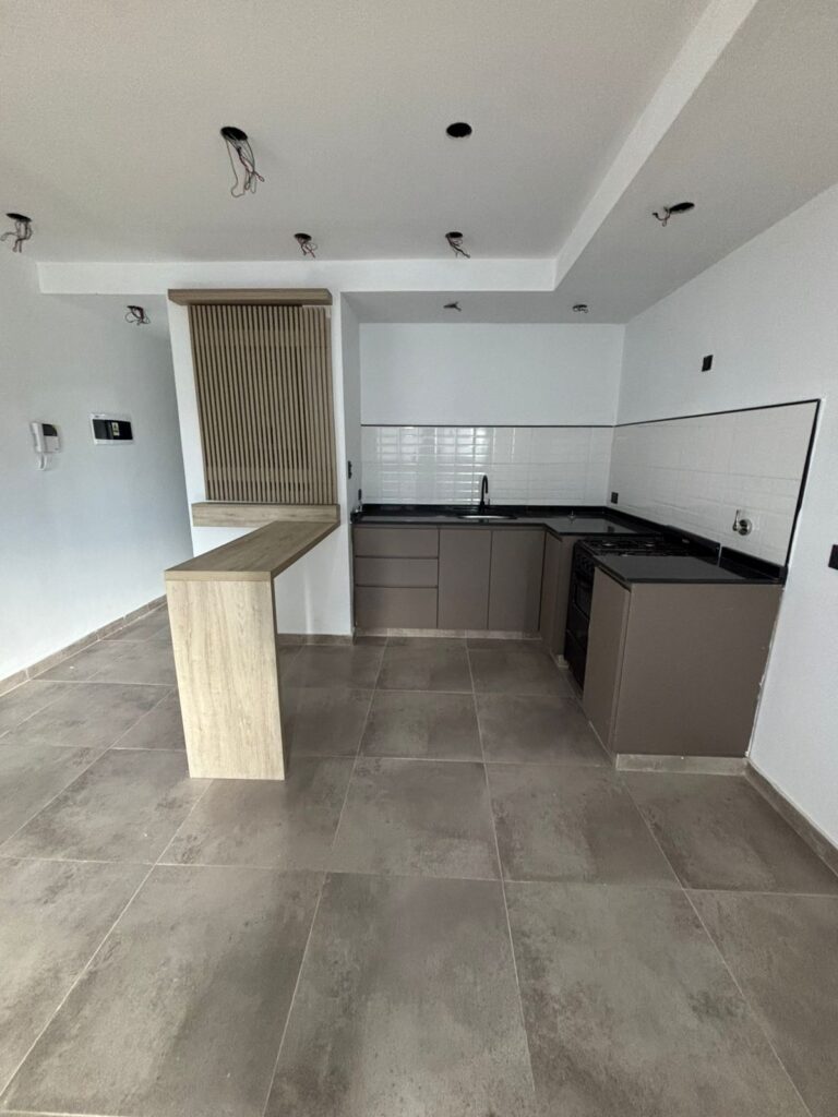 Un dormitorio, baño, cocina comedor living.
